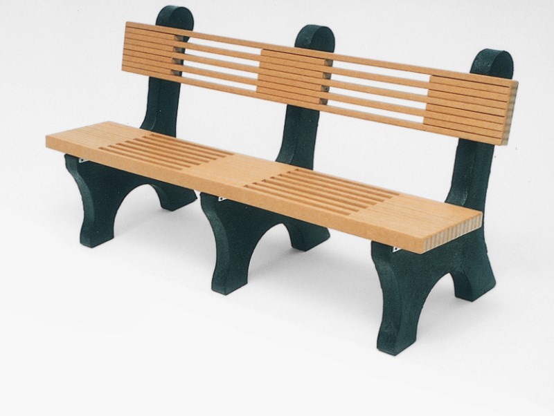 A tasteful, straight-forward design provides a fresh and practical look for your seating areas. It looks great standing alone or in repetition at school campuses, zoos, public parks, hiking/biking trails and tennis courts. The distinctive slat design and molded, recycled plastic frames make these comfortable benches the solution to the maintenance problems of concrete and treated wood benches.