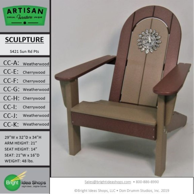 Our Artisan Chair is uniquely created by combining recycled plastic lumber with the original art works of Don Drumm, America's master metal sculptor and designer of aluminum castings.