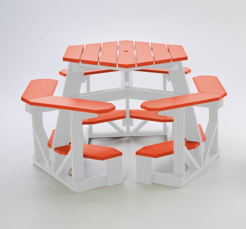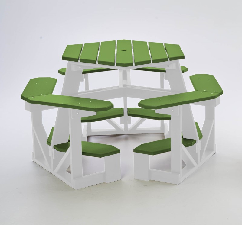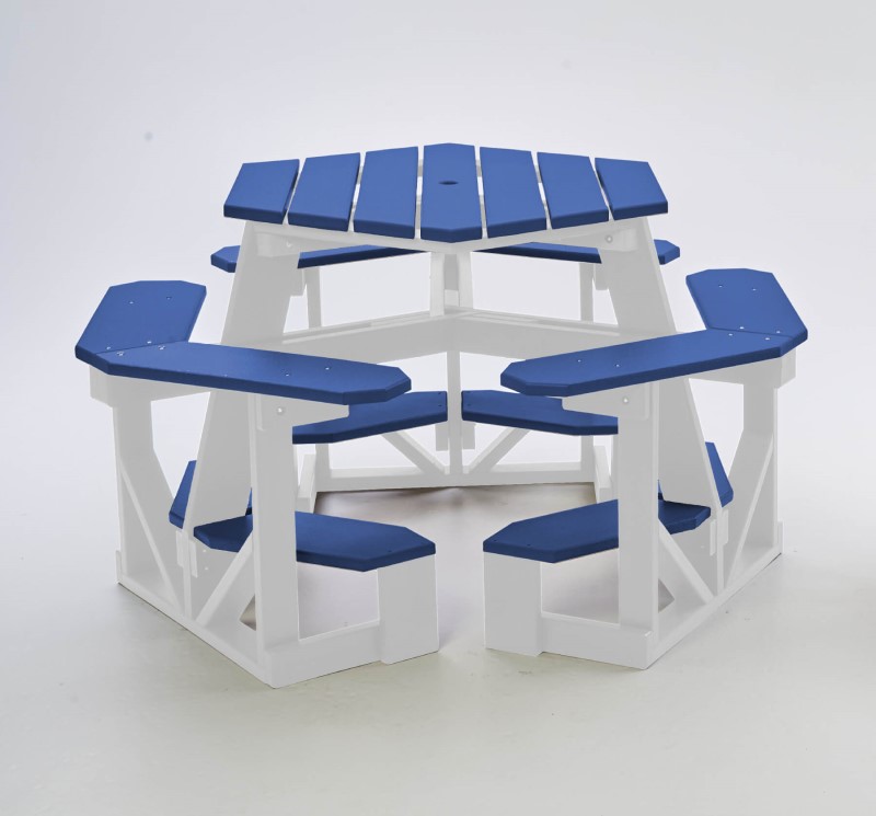 The Pub Height Hex Picnic Table is the big brother to the #1 selling recycled plastic lumber heavy duty picnic table sold since its entry into the market in 1991. Our bar height hexagonal picnic table is best known for its distinctive appearance and design, premium quality recycled HDPE plastic lumber, meticulous craftsmanship, and sturdy durability. No one compares to the Bright Idea Shops products and is the best overall value in the market. Its extra height makes it perfect for adults seating and ideal for great conversation, good food and drink, games and crafts.