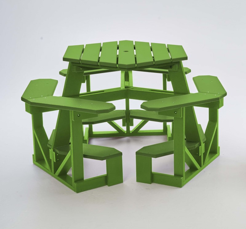 Sustainability: Bright Idea Shops’ HDPE furniture are great for the environment too. Weighing 312 lbs., the Pub Height Hex Table diverts almost 2000 HDPE milk jugs from the waste stream that were heading to the landfill. Just another way the Bright Idea Shops makes plastic recycling a reality.